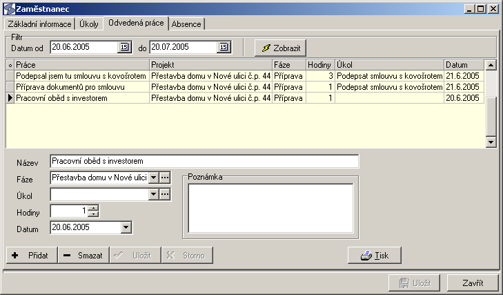 - Souhrny prací jednotlivých zaměstnaců