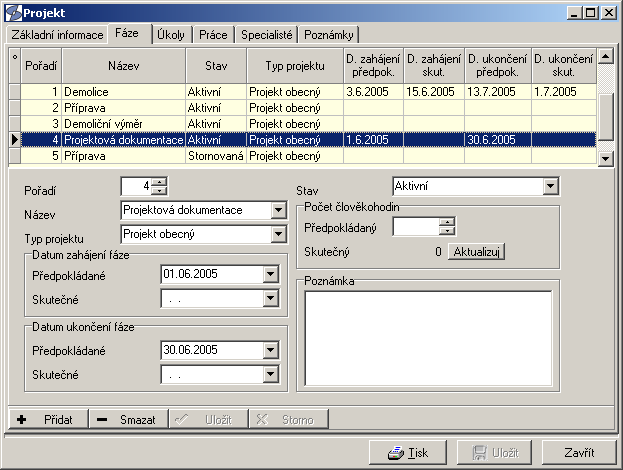 - Evidence projektů, jejich fází, úkolů a prací